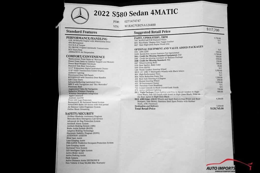 THIS STUNNING 2022 MERCEDES BENZ S580 4MATIC HAS A 4.0L V8 TWIN-TURBOCHARGED ENGINE AND COMES WITH ALL THE RIGHT EQUIPMENT INCLUDING…….